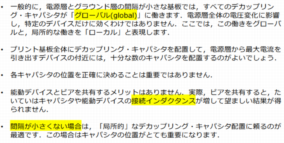 基板の層間隔が小さい場合は,キャパシタの位置に厳密さを求める必要は少なく,数と分布を重視するのが適切です.層間隔が大きい場合は,キャパシタをデバイスごとに配置することでローカルな安定性を確保することが求められます.この違いを理解して設計に反映させることが,プリント基板のEMC対策において重要です.