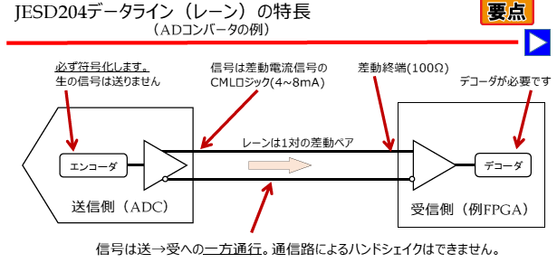JESD204では,ディジタル・データは「レーン」と呼ばれる差動のシリアル信号線を通じて送信されます.A-Dコンバータを用いる場合,送信側はコンバータであり,受信側はFPGAやSoCなどのディジタル処理系です.レーンは一方通行の信号線であり,送信から受信へのデータ伝送だけを許容します.