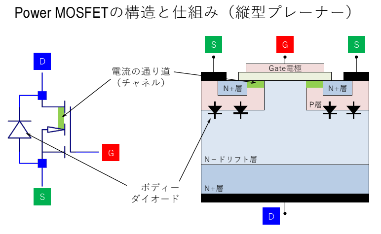 パワーMOSFETは縦型プレーナ構造をもち,電流はソース(S)からドレイン(D)へ,シリコン基板の厚み方向に流れます.この縦型構造により,高耐圧を実現しながら,電流密度を高めることが可能です.
