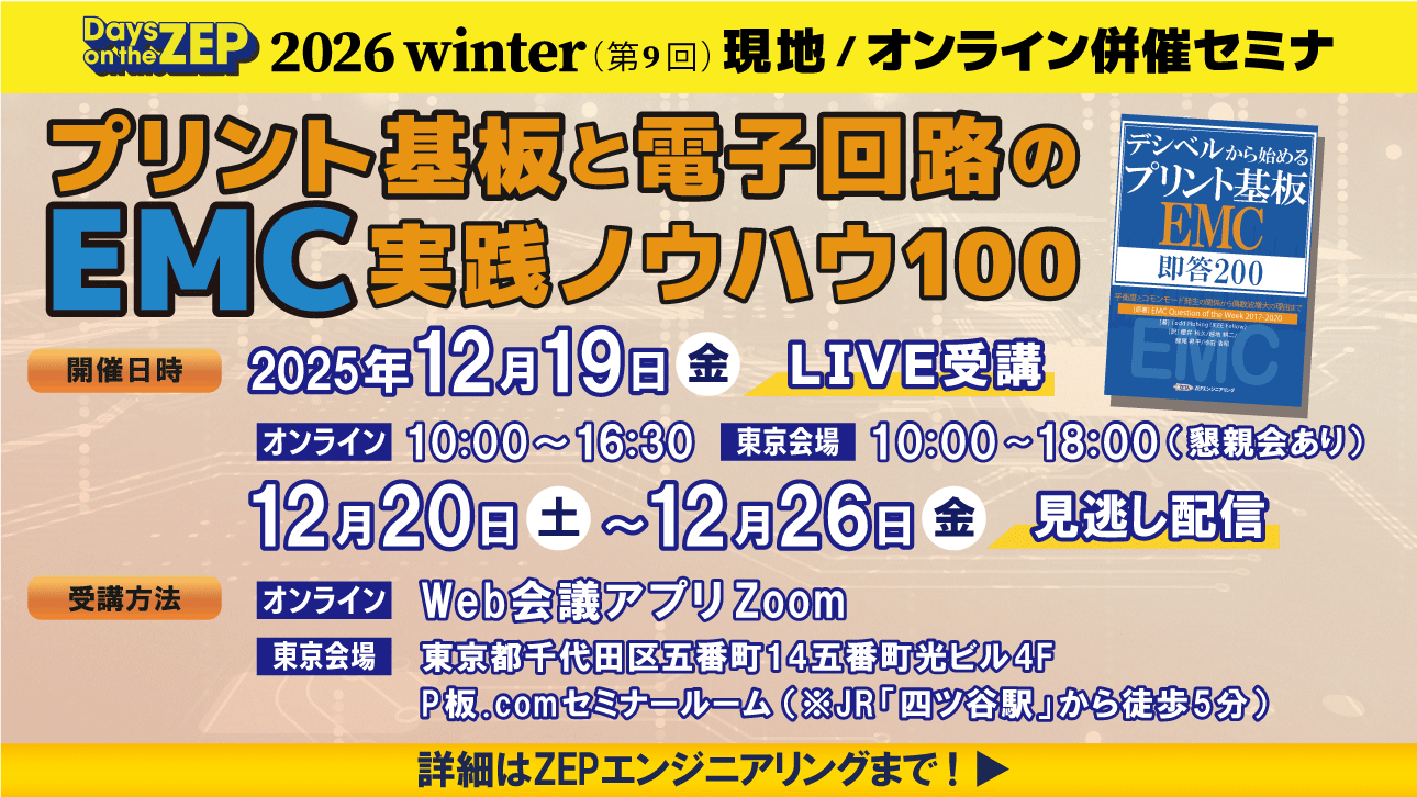 本セミナでは,プリント基板と電子回路の電磁界理論から実践対策まで,100のEMC設計ノウハウを解説します.コモンモード発生のしくみ,信号伝送,静電気対策,部品実装技術などについて,第一線の専門家が理論と設計の両面から解説し,次世代エレクトロニクス開発に不可欠なEMC設計の本質を学ぶことができます.〈ZEPエンジニアリング〉