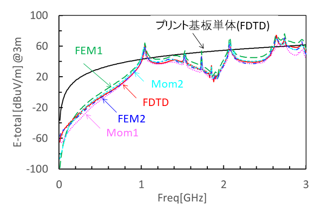 図6に各シミュレータの計算結果を示します.横軸は周波数,縦軸は3m遠方の放射電界です.黒色の実線は,プリント基板単体の放射電界です.