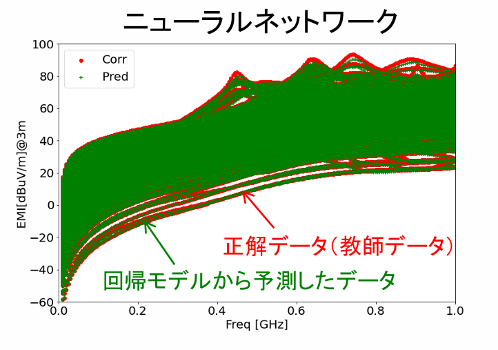 差動線路が2ペアある場合,反射損失(-30dB以下),近端クロストーク(-30dB以下),遠端クロストーク(-30dB以下),挿入損失(-10dB以上)がある設定値になるような配線ルールを遺伝的アルゴリズムで求めます.遺伝的アルゴリズムは,裏で電磁界シミュレーションが必要になりますが,このシミュレーション部分を機械学習で代替します.その結果,通常の遺伝的アルゴリズム+電磁界シミュレーションと比較して,数千倍速く設計ルールを求めることができます. - 配線の物理寸法から遠方放射電界を予測 配線の物理寸法(配線長や絶縁層厚,波源,終端抵抗)から遠方の放射電界(ノイズ)を予測します.これは電磁界シミュレーションの置き換えになります.電磁界シミュレーションと比較して数千倍から数万倍速く遠方電磁界を予測でき,リアルタイムに計算できます.