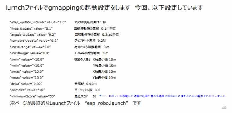 これらのパラメータを適切に設定することで,センサの精度とロボットの動作範囲に最適化した地図生成が可能です.