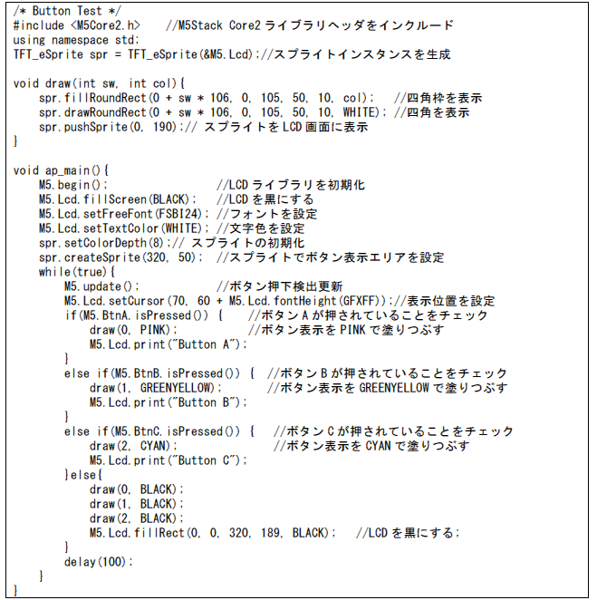 - 押下状態の取得:`M5.BtnA.isPressed()`,`M5.BtnB.isPressed()`,`M5.BtnC.isPressed()`