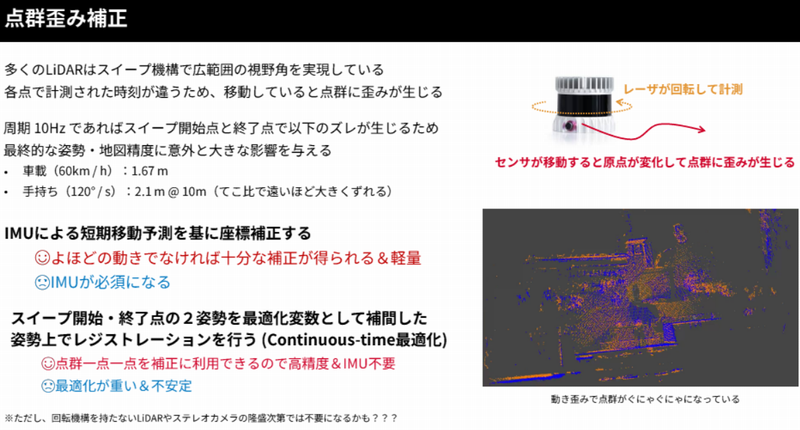 一般的な補正手法として,IMU(慣性計測ユニット)を用いる方法があります.IMUはスキャン中の短期的な移動予測を行い,各点の座標を補正します.これにより,スイープ中のセンサの動きを追従した座標変換が可能です.IMUを使う手法の特徴は以下のとおりです.