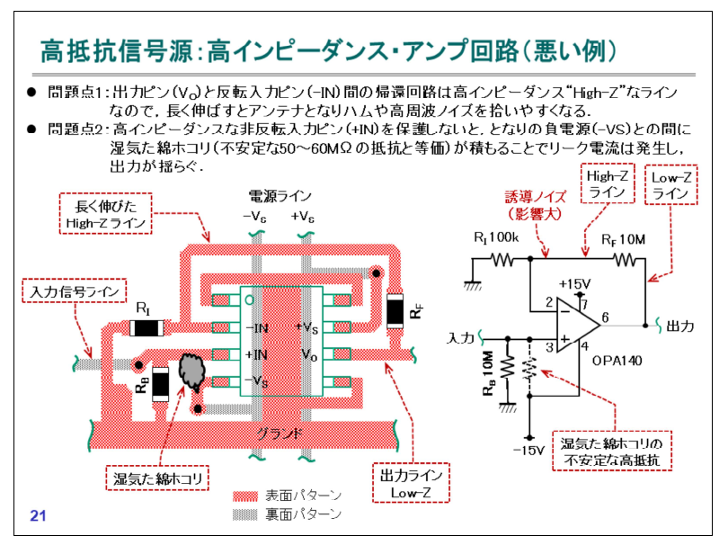 図1 高感度の高入力インピーダンス・アンプ回路を基板に実装するときは,電流リークや寄生容量の悪影響を回避する「ガード・パターン」と「ブートストラップ」の採用が基本.画像クリックで動画を見る.または記事を読む.[提供・著]中村 黄三 詳細:[VOD]高精度アナログ計測回路&基板設計ノウハウ |