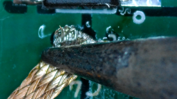 はんだ吸い取り線も非常に有効なツールです.吸い取り線は,はんだを素早く吸収するため,こてと組み合わせて使用することで,部品の取り外し作業が効率化されます.はんだ吸い取り線にあらかじめ少量のはんだを含ませておくと,より効率的に吸い取ることができます.さらに,吸い取った後のフラックスをエタノールで清掃することで,基板の表面を保護し,次の作業への準備が整います.