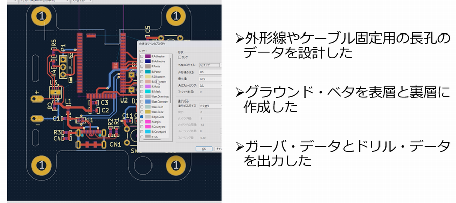 プリント基板設計の最終段階では,ガーバ・データとドリル・データを出力します.ガーバ・データは基板製造用のCADフォーマットであり,「ファイルメニュー」の[プロット]機能から出力できます.