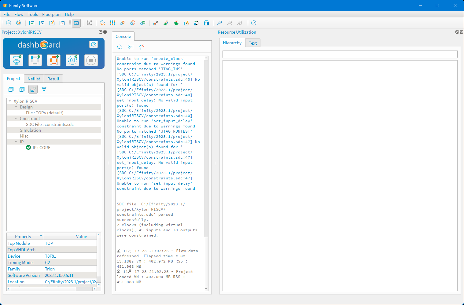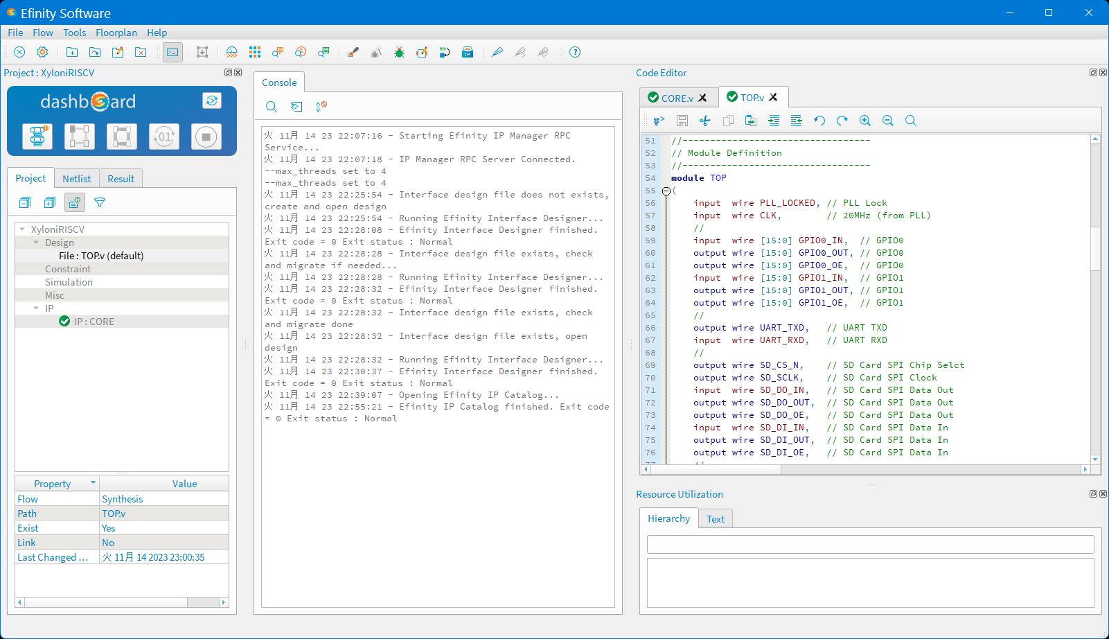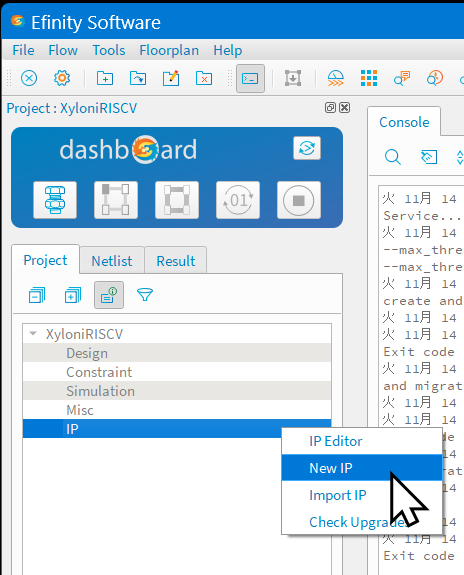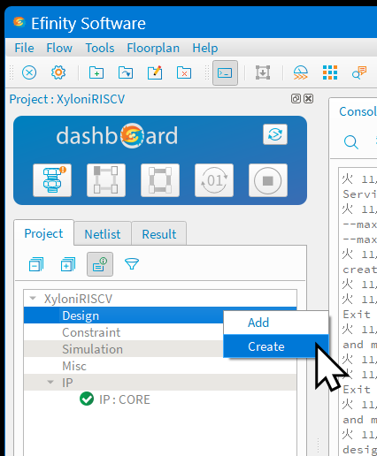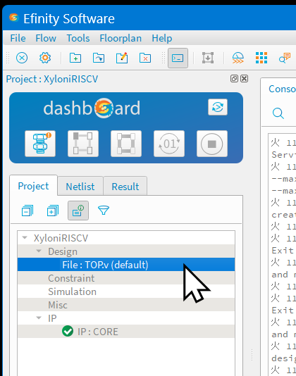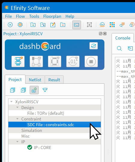 図102のように,FPGA統合化開発環境Efinityを起動して,プロジェクトXyloniRISCV.xmlを開いてください.