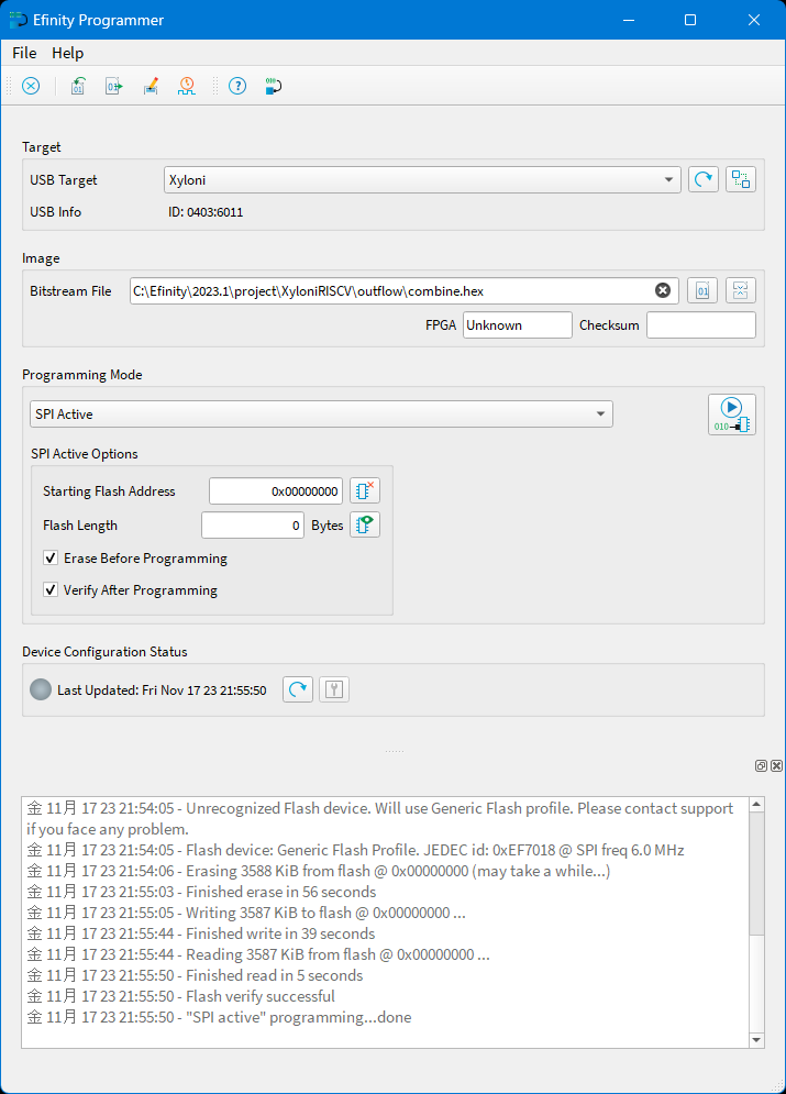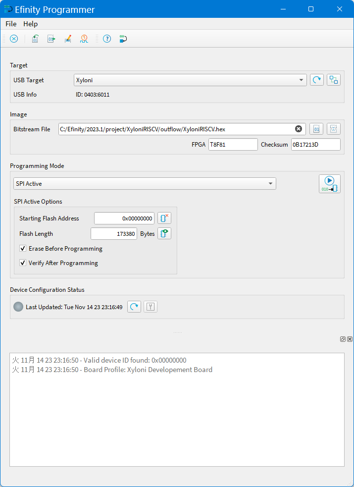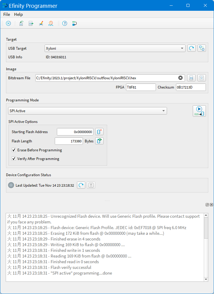 図105の画面に戻りますので,Programming ModeをSPI Activeにして,右側のStart Programを押してください.Xyloniボード上のNOR FLASHメモリへの書き込みが始まります.少し時間がかかりますが,図105の一番下に示すようにベリファイまで成功したメッセージが出ればOKです.