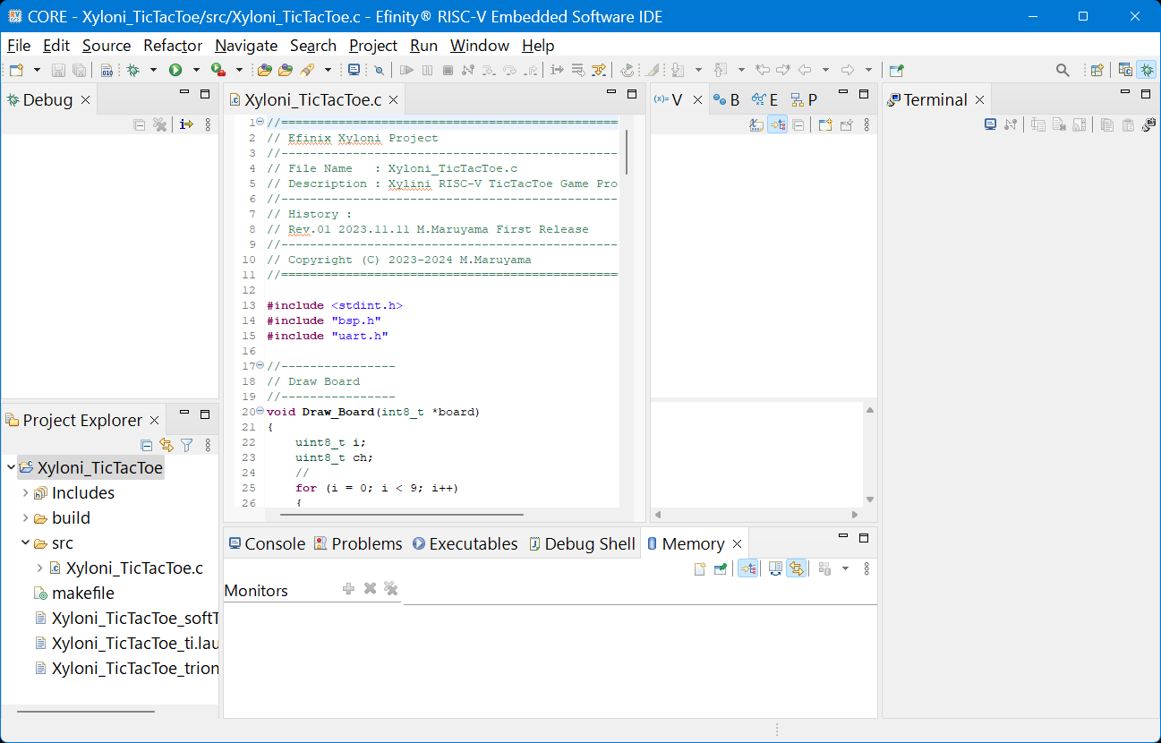 ビルドしたプログラムをデバッガからXyloniボードにダウンロードして動かすために,メニューWindow→Perspective→OpenPerspective→Debugを選択してください.さらに,メニューWindow→Show View→Terminalを選択します.画面内のどこかのタブに追加されます.