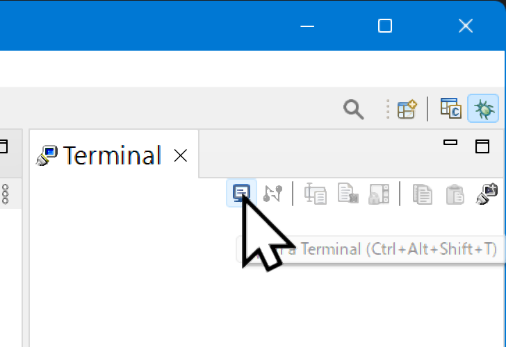 UART通信ターミナル上でキーボード入力操作をするため,Terminalタブ画面内をクリックして前面に出しておいてください.ここで,ブレークしていたプログラムの実行を再開するため(図101),Resumeボタン(図81)を押してください.