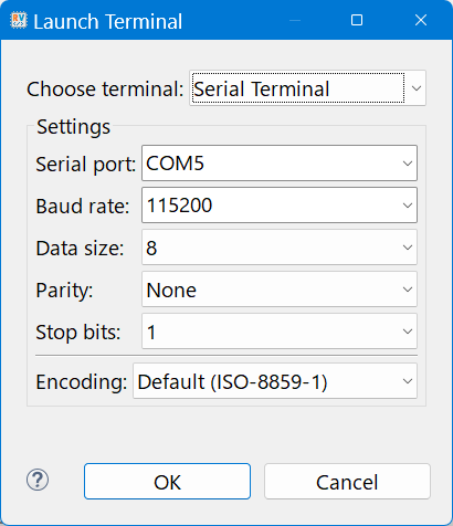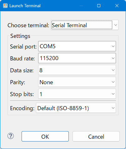 XyloniボードをPCのUSBポートに接続してください.前項と同様に,Terminal内のOpen a Terminalボタンを押して,通信パラメータを図98のように設定してください.COMポート番号は,Windowsのデバイス・マネージャを開いて確認して選択してください.