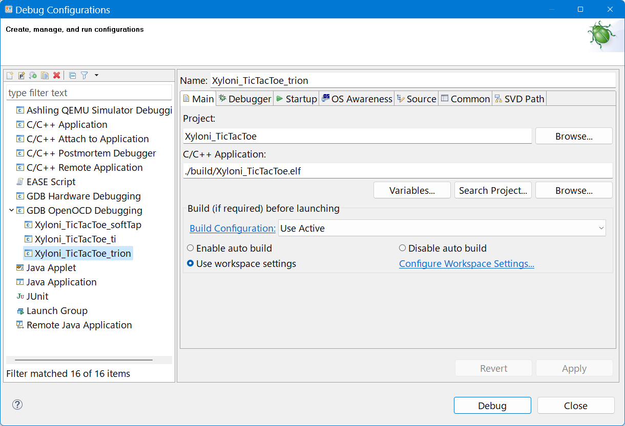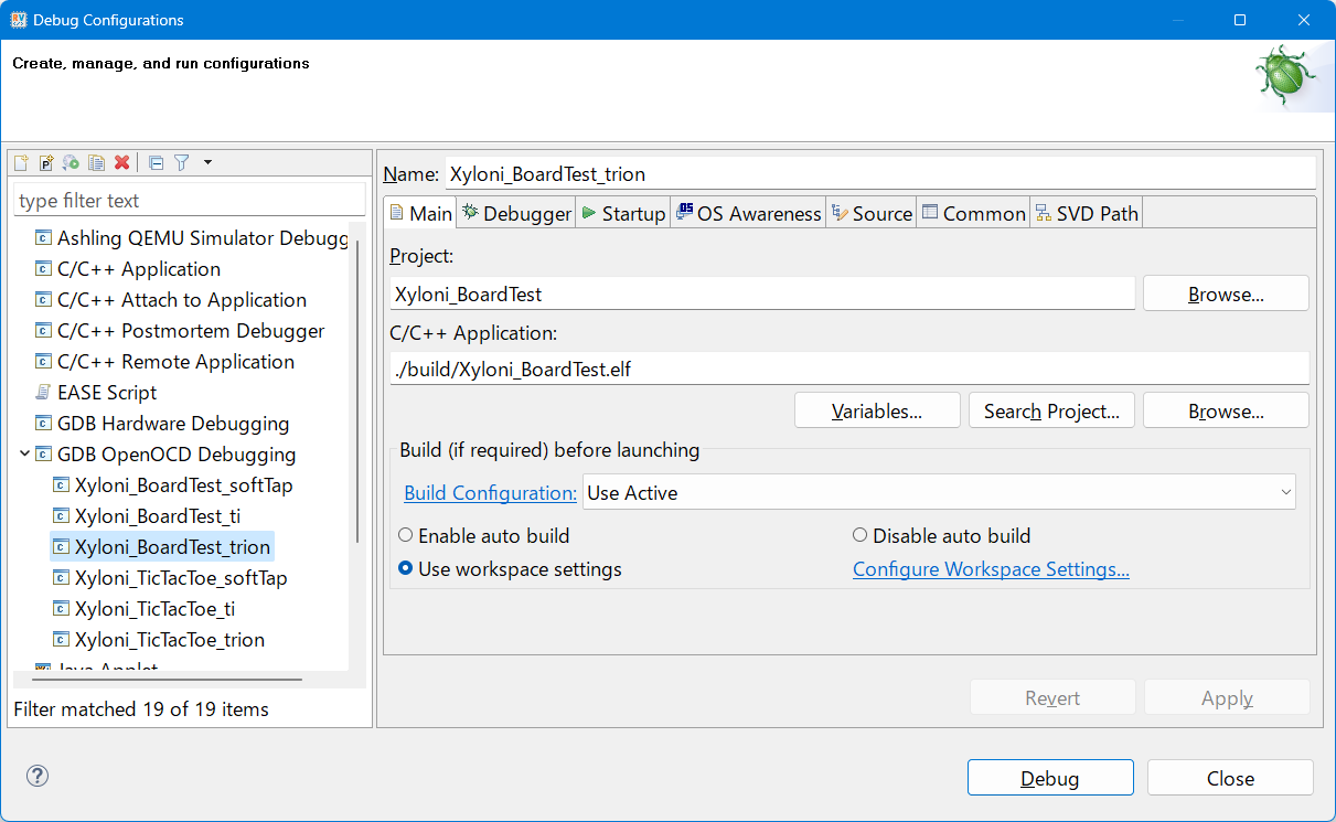 図99の画面が出るので,左側の画面からGDB OpenOCD Debugging→Xyloni_BoardTest_trionを選択します.すでにデバッグ関連のパラメータが設定されてあります.右下のDebugボタンを押すと,Xyloniボードとの間でデバッグ・セッションを開始します.