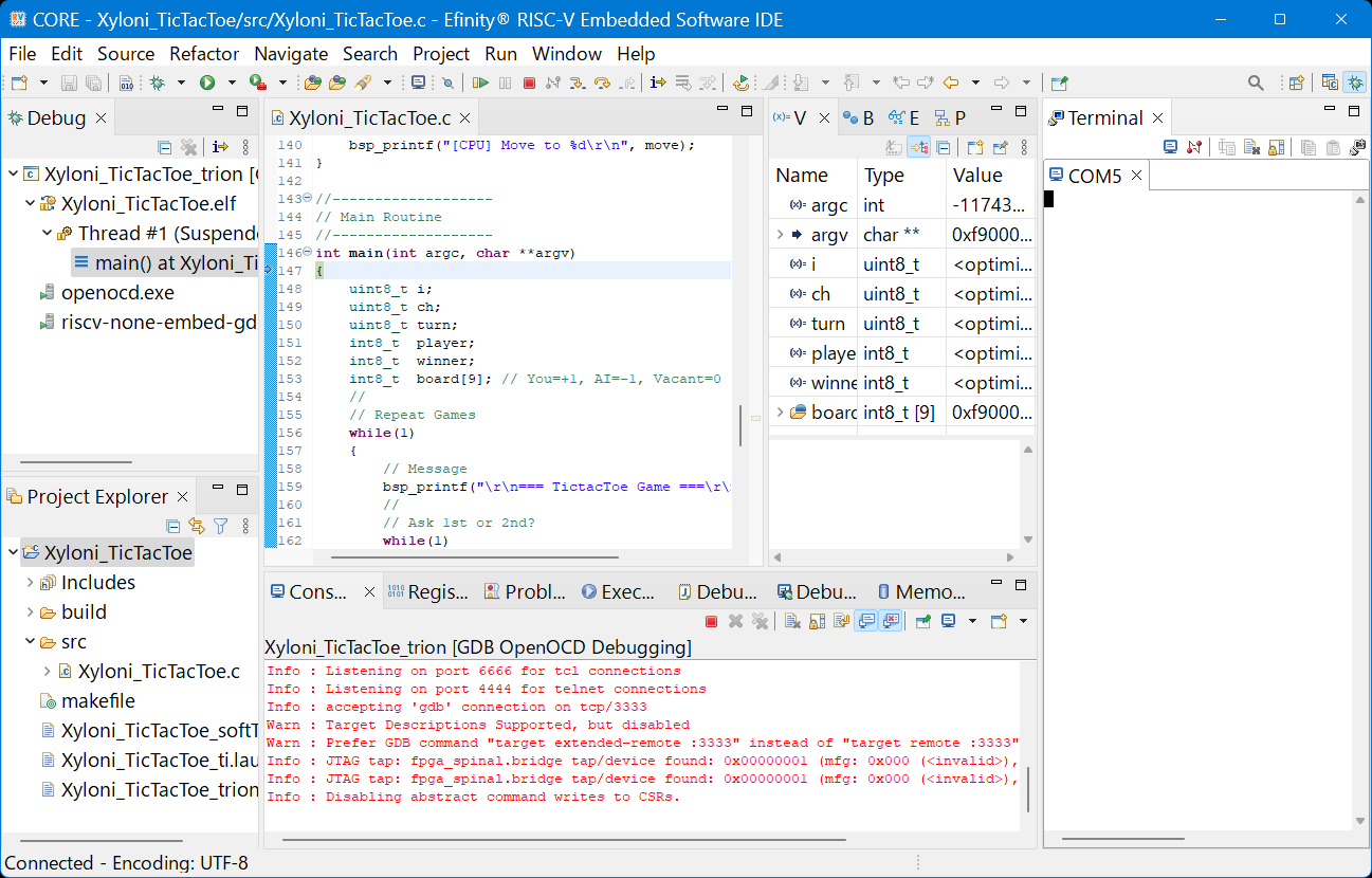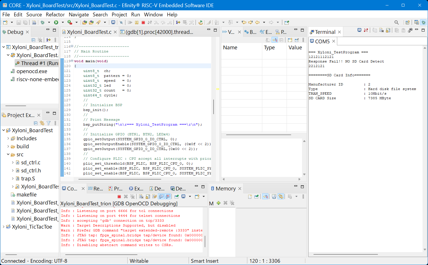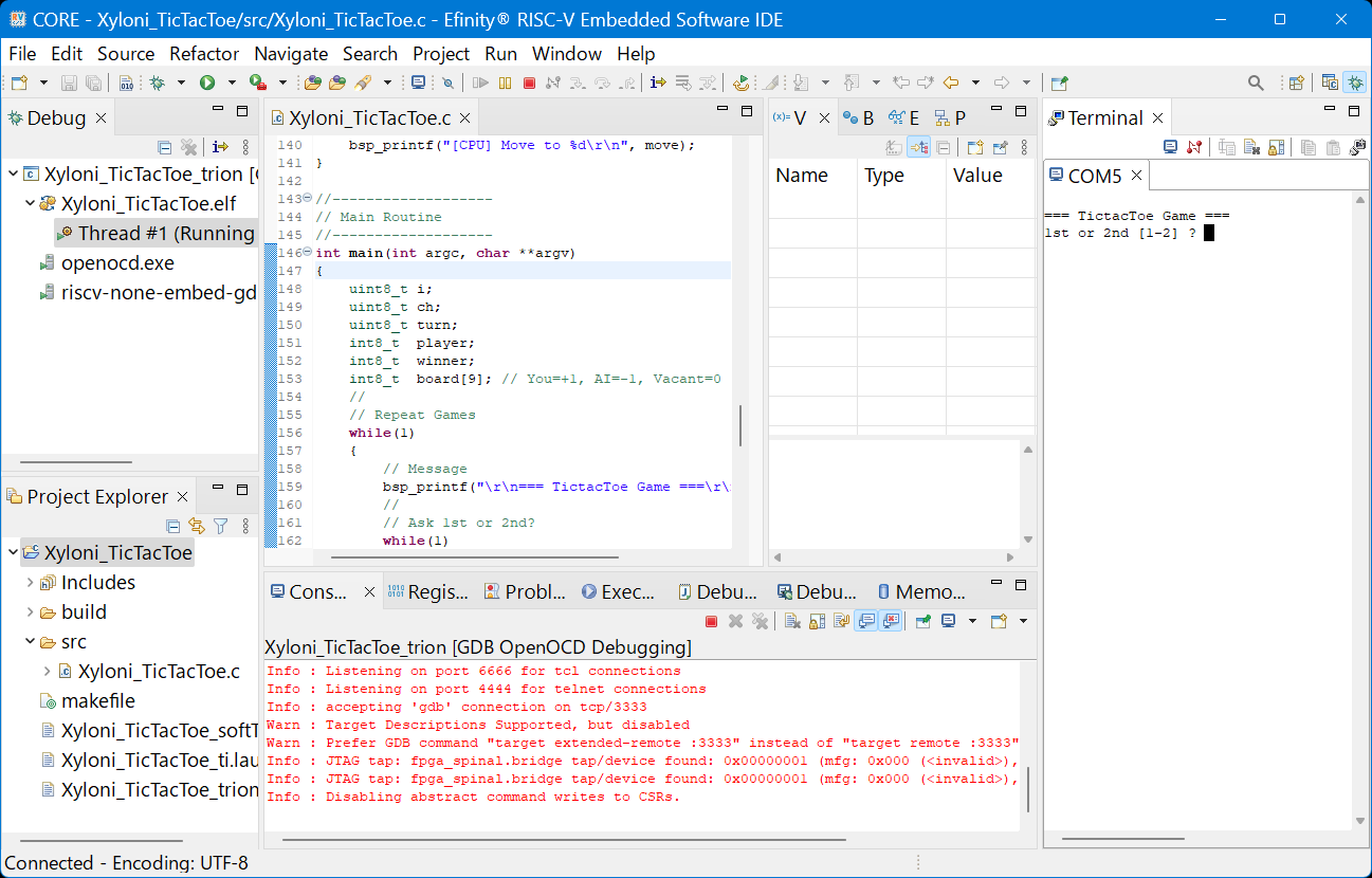 デバッグ・セッションがはじまると,自動的にプログラムがXyloniボードの中のSapphire SoC IPのRAMにダウンロードされ,プログラム実行を開始し,main()関数の先頭でブレークして一旦実行停止します.その様子を図100に示します.