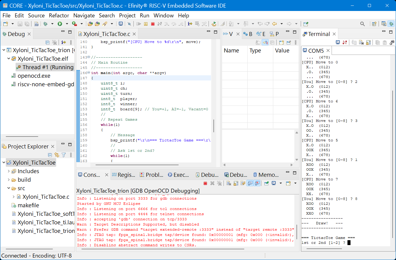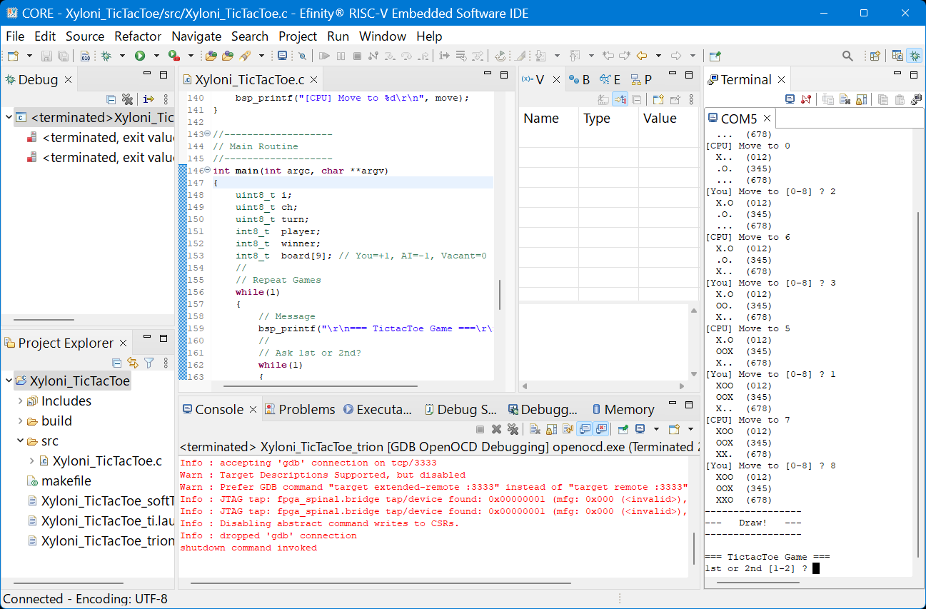 PCからXyloniボードを抜いて,再度接続すれば,すぐに動作を開始すると思います.このように,電源投入すれば自分のプログラムをRISC-Vの上ですぐに動かすこともできます.