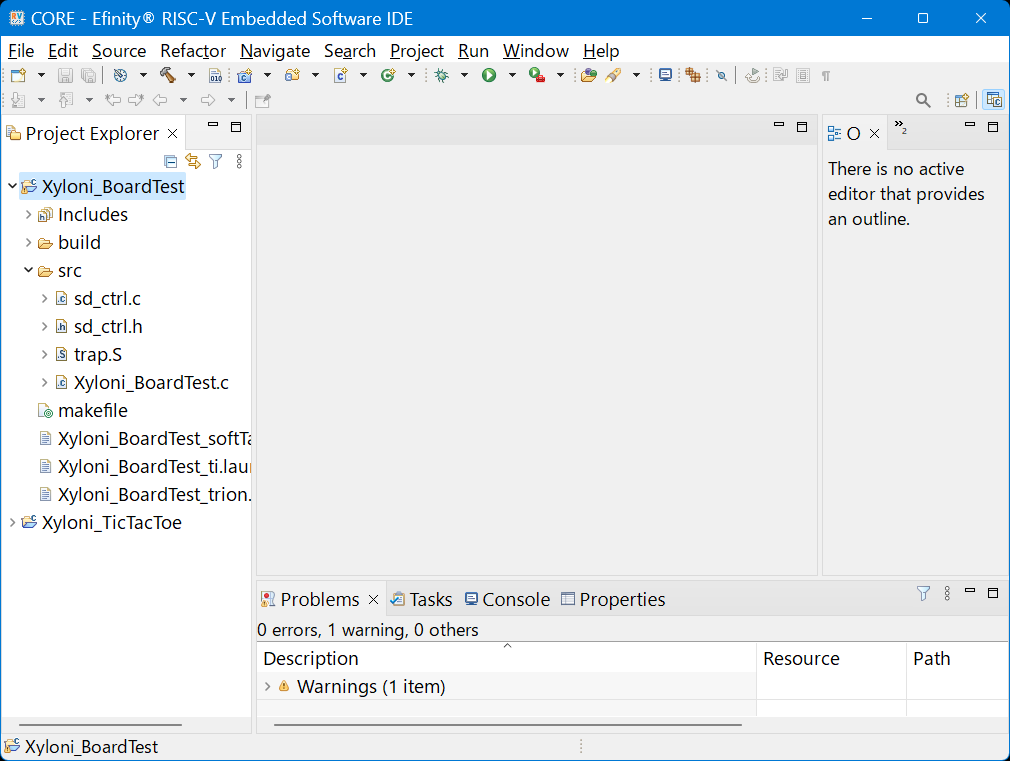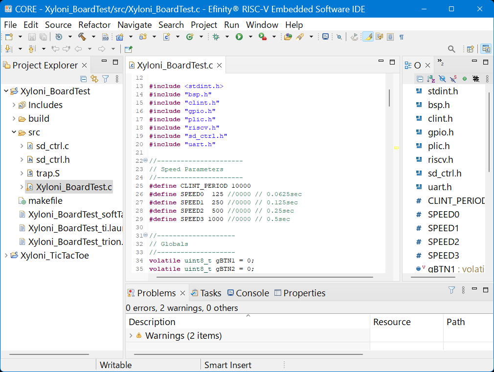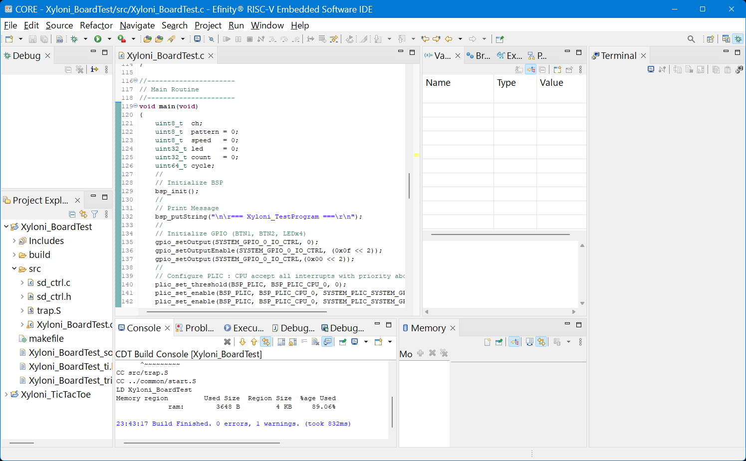 ビルド結果を見ると,spi.hの中でbsp_uDelay()が暗黙的に使われていることを示すワーニングが出ています.最終的にリンクは通るので問題はないですが,このワーニングを消したければ,画面左のProject Exproler内,Xyloni_BoardTest→Includes→...XyloniRISCV/embedded_sw/CORE/sortware/standalone/driverの下のspi.hを開き,先頭に#include ``bsp.h''を追加して,再ビルドしてください.