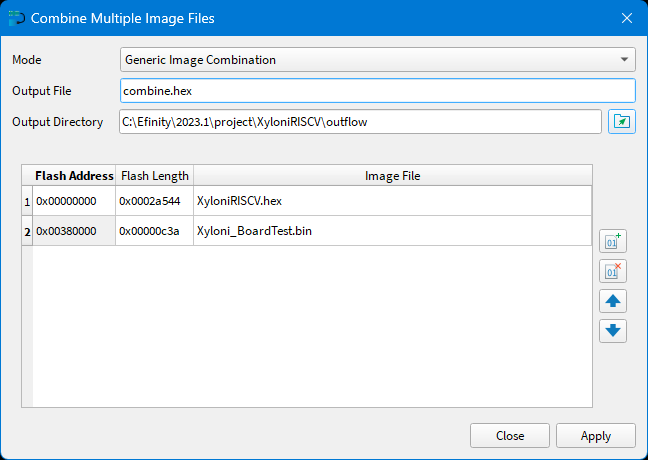 ModeはGeneric Image Combinationを選択し,Output Fileにはcombine.hexを入力してください.Output Directoryはデフォルトで...\XyloniRISCV\outflowになっていることを確認してください.