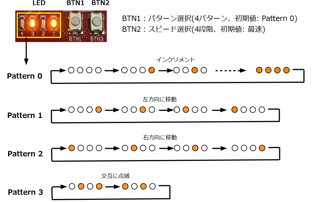 まず,gTickはクリアして次に備えます.LED点滅スピードを作るため,カウンタ変数countをインクリメントします.countがspeedに対応した点滅タイミングになったら,点滅パターンpatternに応じてLED出力変数ledを変化させます.最後に変数ledをGPIO0[5:2]に出力します.そしてまたループの最初に戻ります.