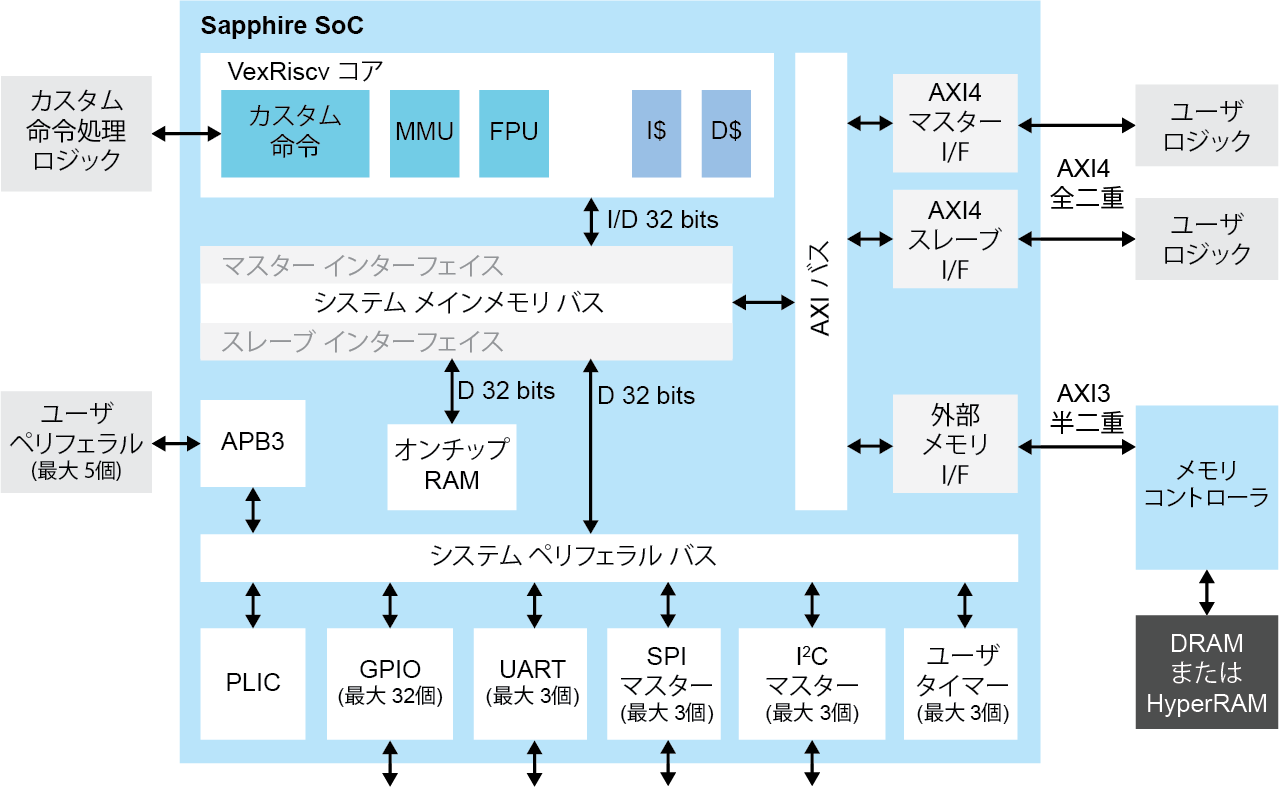 そのため,従来のARMのように1社にCPUアーキテクチャが独占されることがなくなり,現在では多くの実装がカスタマイズ含め存在し,加速度的に普及が拡大しています.Efinix社も,RISC-V CPUコアと周辺機能を含むSapphire RISC-V SoCをIPとして提供しています.