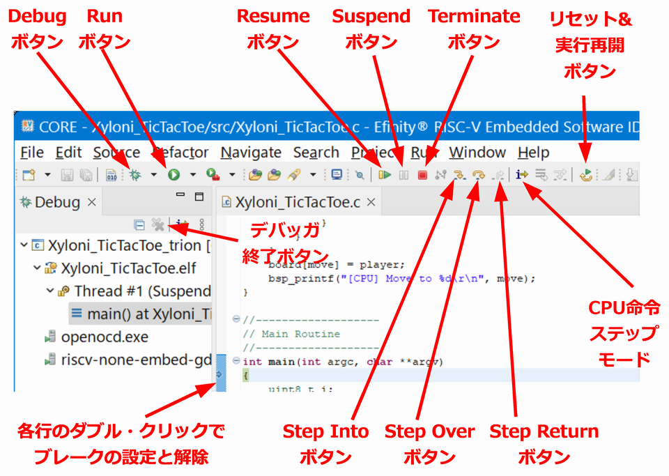 画面の例を図6に示します.C/C++言語のソース・コード編集から,プログラムのビルド,エミュレータによるシミュレーション,実機へのダウンロードとデバッグを行なえます.内容としてはオープンなEclipseベースの統合開発環境に,GNUツール・チェーンとOpenOCDを統合したものであり,RISC-V向けとしてはとても標準的で実績があるものです.