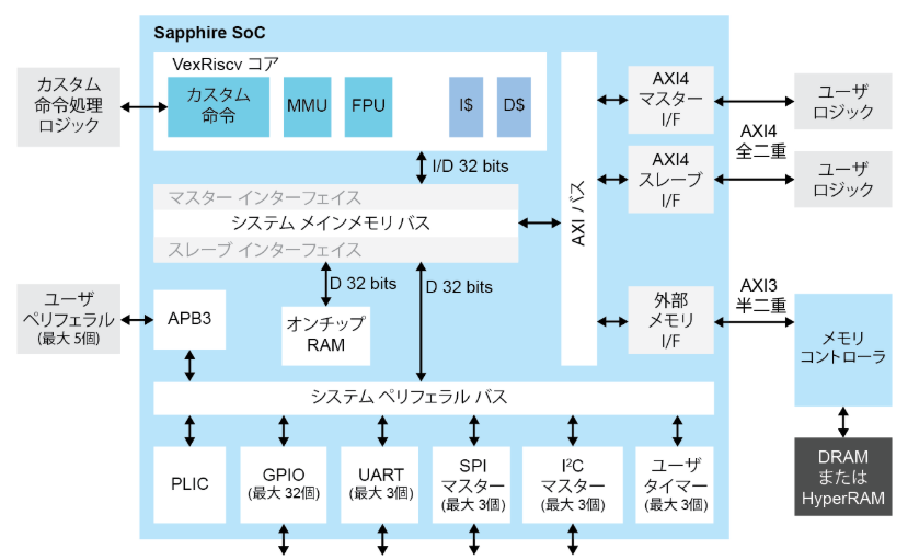 Sapphire SoCのAXIマスタ・チャネルは,データ幅を32~512ビットで設定可能です.これにより,画像処理や高速信号処理など,大量のデータ転送が必要なアプリケーションにも対応できます.一方でスレーブ・チャネルを用いることで,ユーザ設計側からSoC内のリソースへアクセスする機構も実現できます.