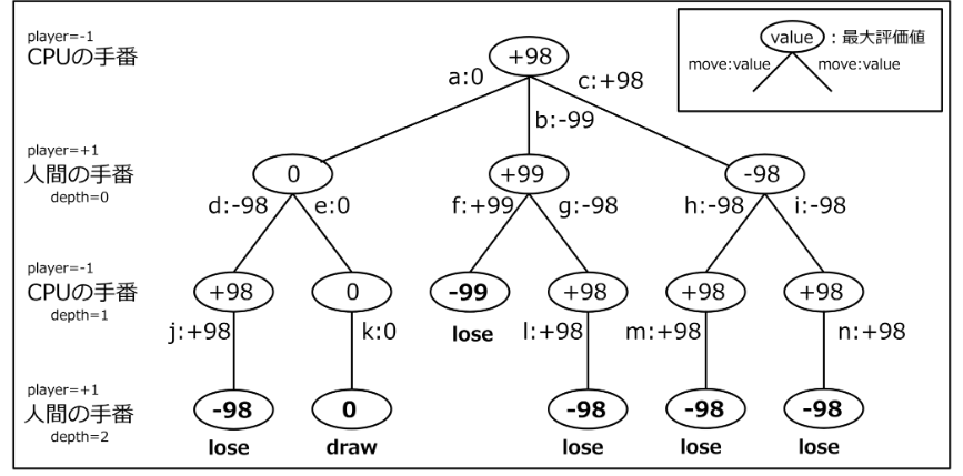 MiniMax法では,ゲームの状態をノード,可能な手を枝とする木構造を作成します.交互にプレイヤが動くため,奇数深度では最小化(相手の最善手を想定),偶数深度では最大化(自分の最善手を選択)になります.このようにして,ツリーのルートにおける最適な一手を選定することが可能です.