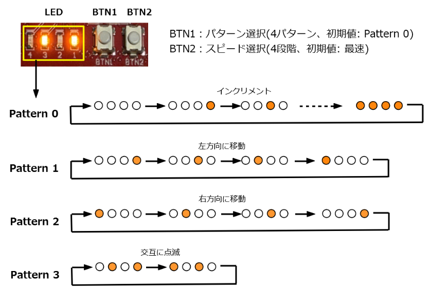 LEDの点滅パターンは4種類あります.点滅パターンはBTN1の操作で順に切り替えることができます.点滅速度はBTN2で変更でき,4段階で切り替わります.さらに,UARTターミナルを接続していれば,1や2を入力することでBTN1,BTN2の操作を代替できます.