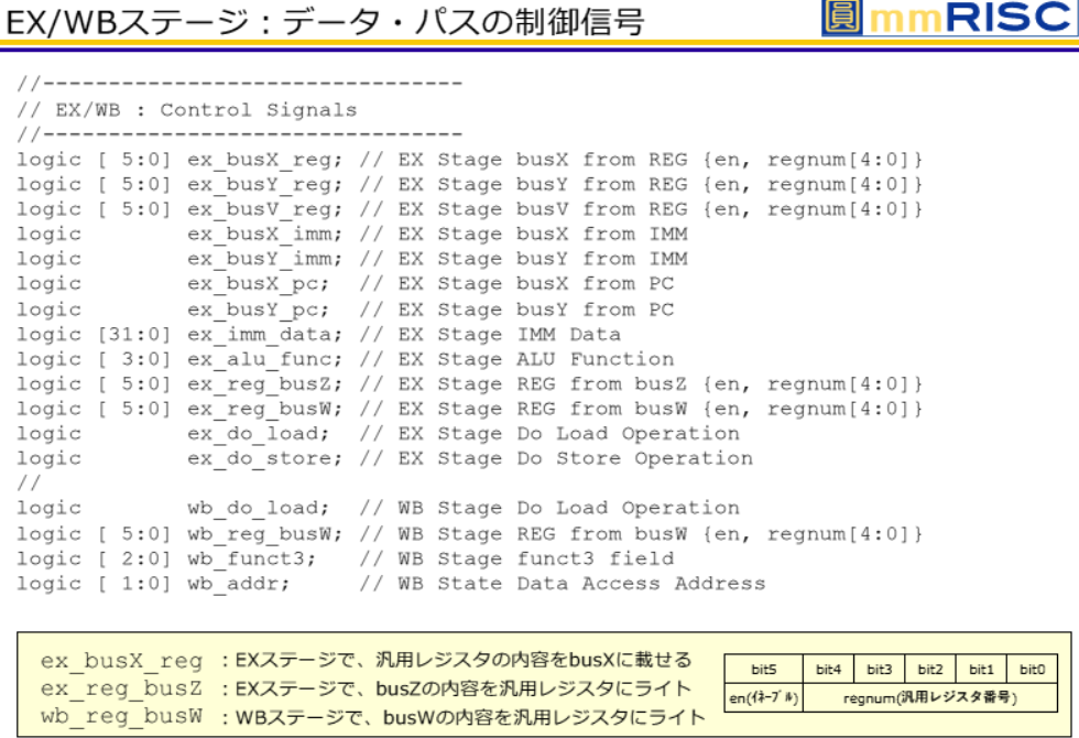 EXステージでは,デコーダが生成した制御信号に従い,汎用レジスタからのデータ読み出しやALUによる演算,メモリ・アクセスの開始を行います.制御信号はbusXやbusYなどの内部バスに接続され,演算対象や即値($imm$)をALUに渡します.また,結果はbusZ経由で目的のレジスタ$rd$に書き込みます.これにより,命令の順次実行とパイプライン処理が効率的に行われます.