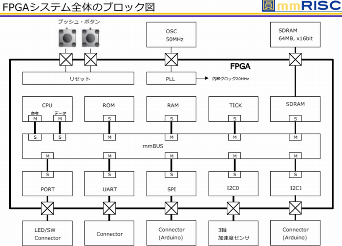 FPGAボード上にはプッシュ・ボタン,LED,スイッチ用コネクタが用意されており,Arduinoシールドの接続も可能です.SPIやI2Cの通信もこれらのコネクタを通して外部シールドに接続できます.これにより,CPUからROM/RAMまでの基本構成と,I/Oや外部デバイスとのインターフェースを一貫して理解できます.