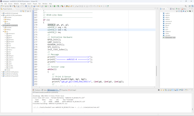 - LED点滅 / UART通信とprintf() / FPGAボード上の3軸加速度センサの読み取り / TicTacToeゲーム / ベンチマーク Dhrystone / ベンチマーク Coremark / LCDタッチパネルを使った応用例