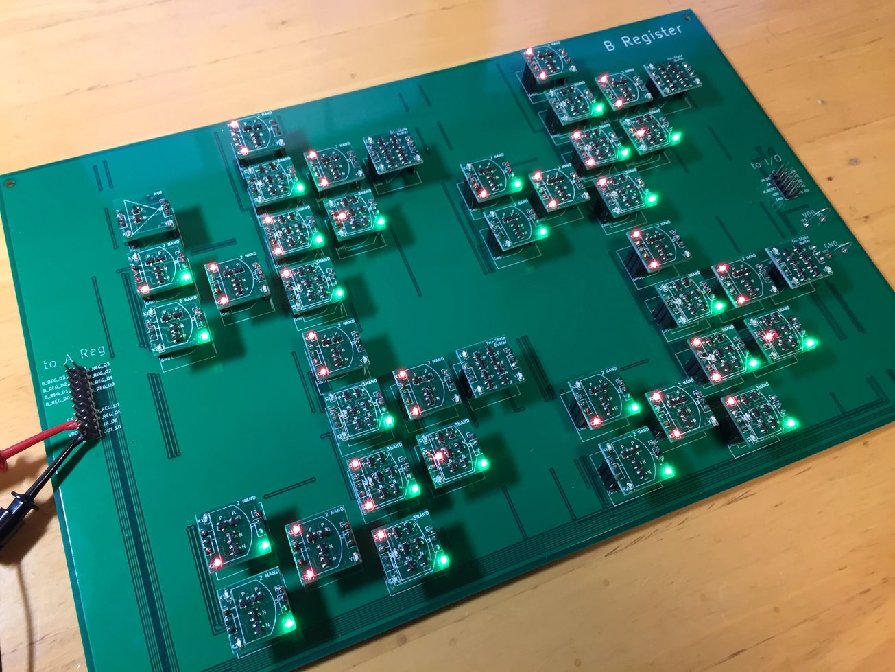 写真4は,図16の回路を「デジタル回路ブロック」で作ったようすです.これがCPUキット“CPU1738”の「B REG基板」となります.論理ゲートの数は41個,使用トランジスタ数は210個です.