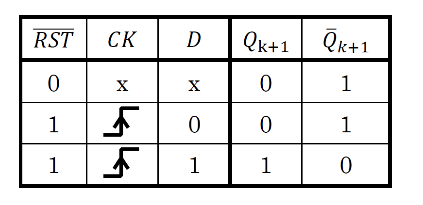 図6に示すD-FFは,リセット端子“$\overline{RST}$”をもっています.このフリップフロップの特性表を表2に示します.クロック入力“$CK$”に対する挙動は先に考えたD-FFと同じですが,“$\overline{RST}$”端子を“0”にすると強制的に出力が“$Q = 0$”となります.このように,クロック信号と同期せず,任意のタイミングでリセットができる機能を「非同期リセット」といいます.よって,この回路は「非同期リセット付きのポジティブ・エッジ・トリガ型D-FF」ということになります.