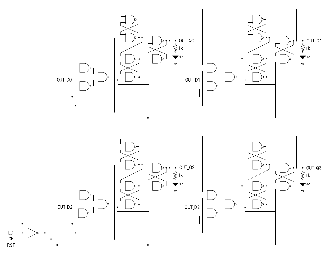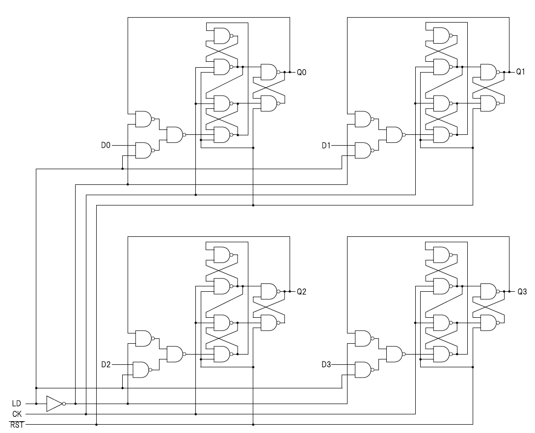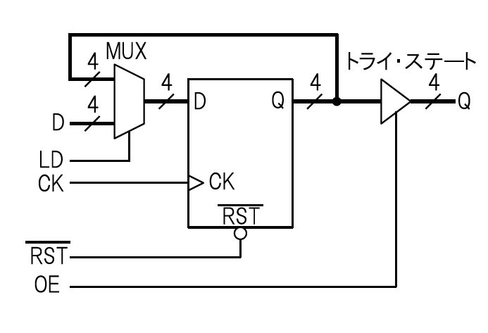 後でCPUの回路全体を組み立てるときに,このAレジスタのデータ入力端子は4ビットの「データ・バス」に接続されます.このバスに流れているデータはAレジスタに対するものだけではなく,他の回路ブロックに向けたデータも含まれます.そのため,毎回クロックの立ち上がり・エッジでデータを読み込んでいると,不要なデータまで読み込んでしまう可能性があります.そこで,データの読み込みを制御する「ロード端子」“$LD$”を付けることにします.“$LD = 1$”のときは入力されたデータを読み込んで出力に反映させますが,“$LD = 0$”のときは新しいデータをロードせず現在の出力状態を保持します.
