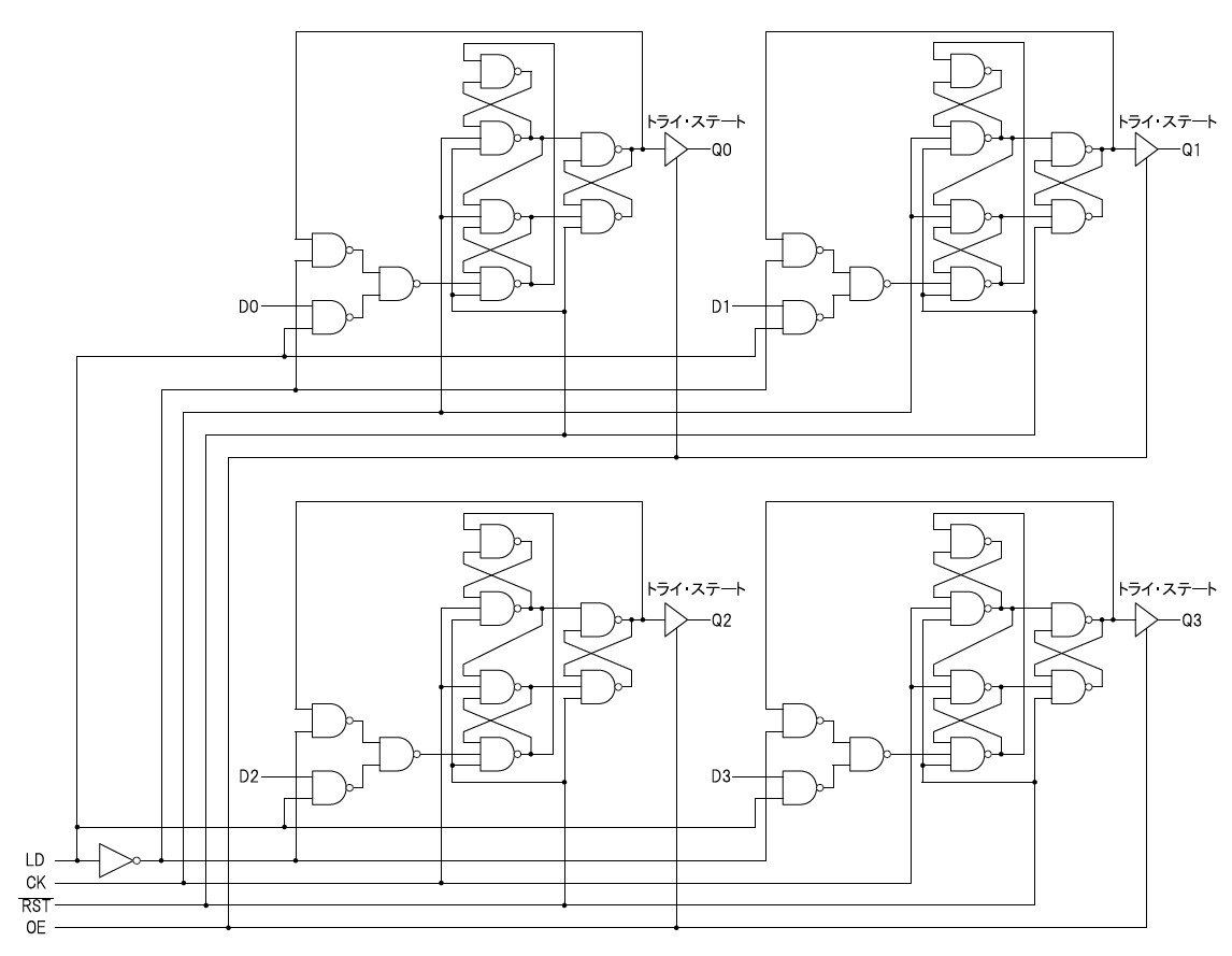 図16に,論理ゲート・レベルで設計したBレジスタの回路図を示します.出力部分にトライ・ステート・バッファが付いている以外はAレジスタの回路図と同じです.