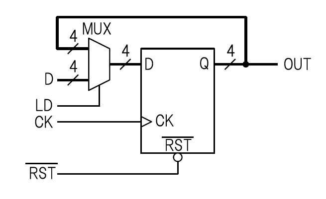 新しいデータを読み込むか直前のデータを保持するかを選択するために,信号選択回路である「マルチプレクサ」(multiplexer,MUX)を使います.MUXの信号選択端子を“$LD$”端子として外部に引き出します.“$LD = 0$”のときはD-FFの入力“D”に出力“$Q$”が接続されるようにします.また,“$LD = 1$”のときは外部からの入力データがD-FFの入力“$D$”に接続されるようにします.