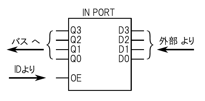 入力ポートは,外部回路から入力された信号を適切なタイミングで内部バスに通す回路です.図20に入力ポートの入出力仕様,表6に入力ポートの動作を表す真理値表を示します.入力ポートの出力回路は“$OE = 0$”の場合に“High-Z”となり,CPUのバス配線から電気的に切り離されます.“$OE = 1$”とした場合は入力ポートの出力がバス配線に接続され,外部回路から入力されたデータをCPU内部のレジスタに格納できるようになります.
