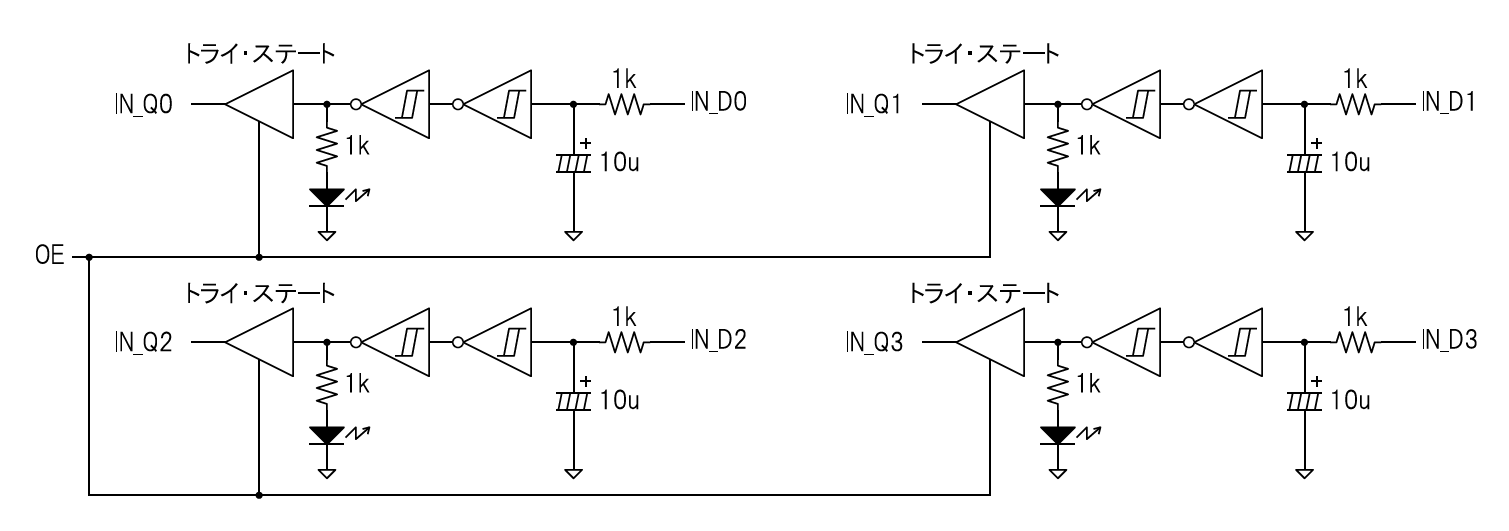 図22に入力ポートを論理ゲート・レベルで作った回路図を示します.シュミット・トリガの入力部分には抵抗とコンデンサで作ったローパス・フィルタを入れてあります.また,入力信号を確認するためにシュミット・トリガの出力部分にLEDを付けました.