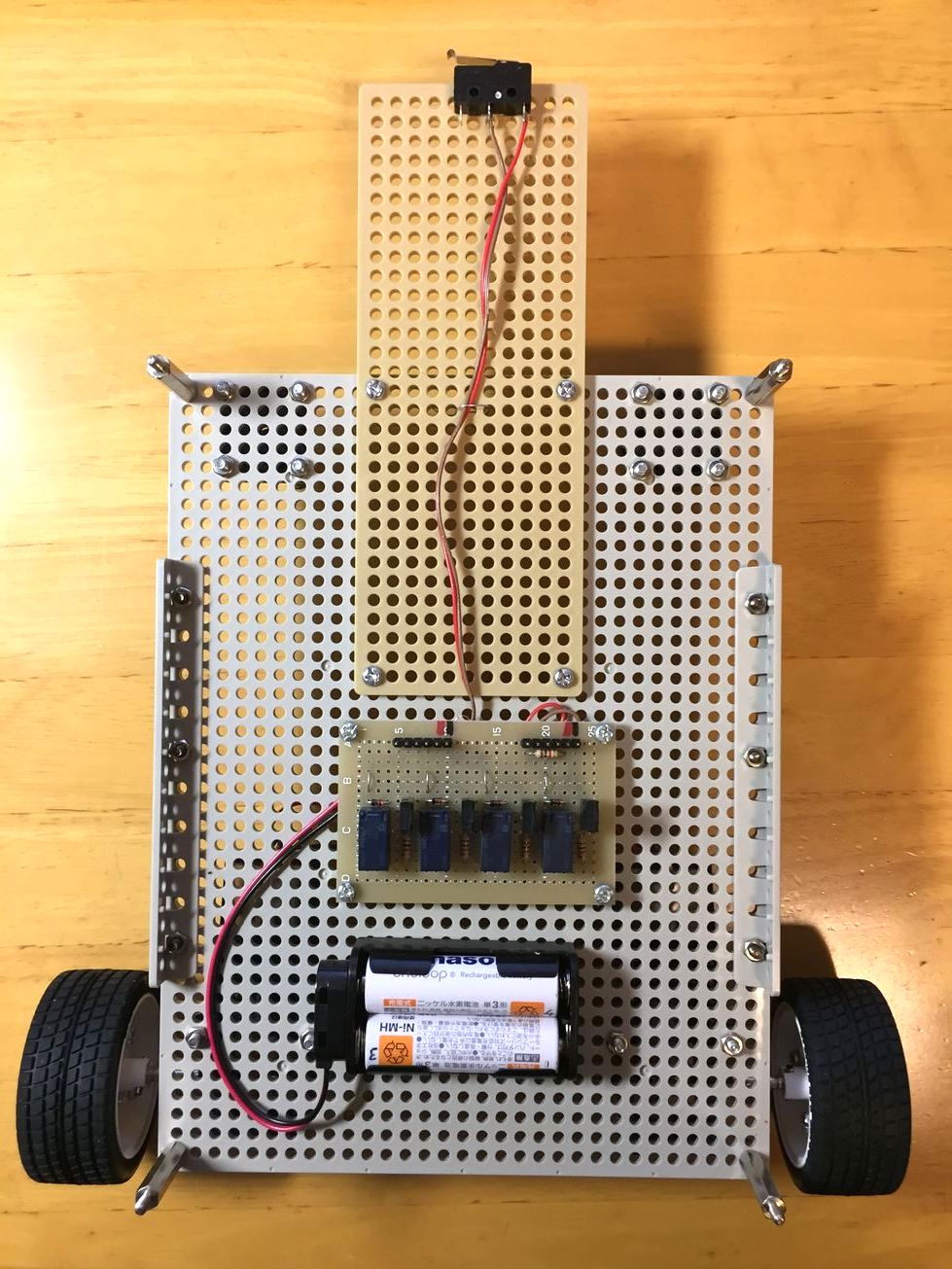CPU本体とロボットのシャーシを合体させると,写真4のようになります.シャーシの前方に取り付けたスイッチがCPU本体で隠れないように,スイッチを取り付ける位置を調整してください.