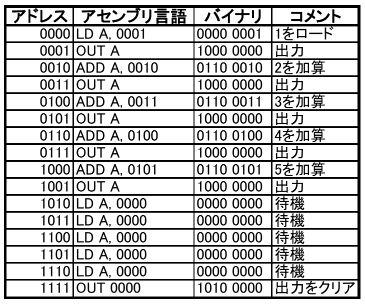 さっそく,簡単な加算命令を実行するプログラムを作ってみましょう.表3に示すのは,“$1+2+3+4+5=15$”という計算を実行するプログラムです.途中計算はAレジスタを利用して行い,最終結果をOUTポートに出力します.