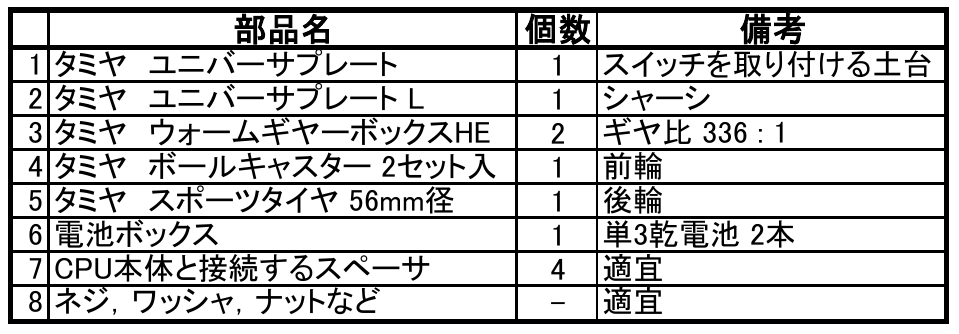 表8の部品を使って,簡単なシャーシを作ります.「ウォームギヤーボックス HE」のギア比は“336:1”にしてください.このギア比(ロボットが進むスピード)にあわせて,後で作るプログラムを調整します.完成したシャーシを写真3に示します.