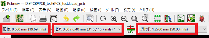 配線パターンを描く前に,配線幅とビアの大きさ,グリッド間隔を設定しておきます.今回は図100に示すように,配線幅を“0.5 mm”,ビアの直径/ドリル径を“0.8 mm/0.4 mm”,グリッド間隔を“1.27 mm”として作業を行いました.この設定は状況に応じてお好みで変更してください.ただし,配線時のグリッド間隔はインチ単位できりが良い値(1.27 mmや0.635 mmなど)に統一することをおすすめします.