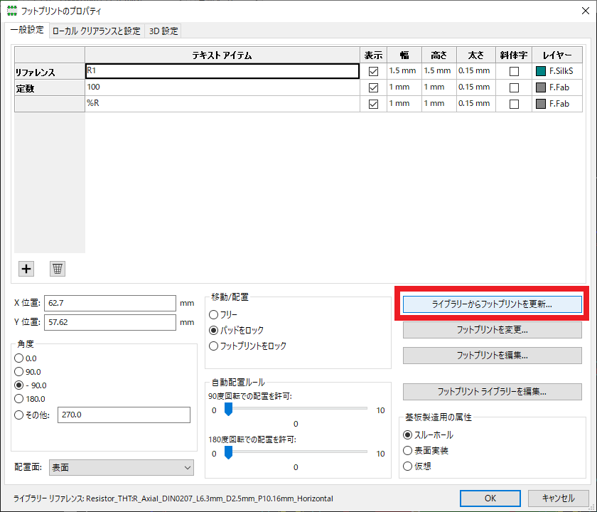 図121に示すように対象のフットプリントのプロパティを表示して,「ライブラリーからフットプリントを更新」をクリックします.