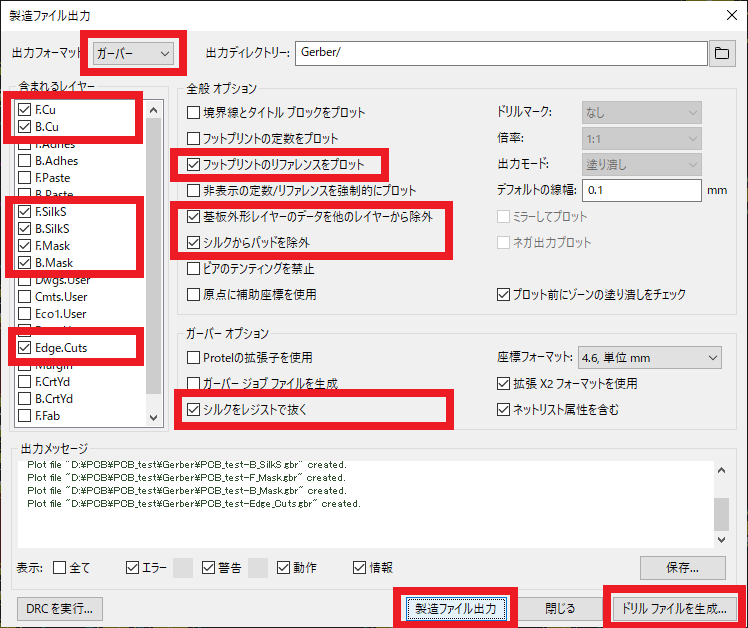 あとは基本的にデフォルトのままですが,「フットプリントのリファレンスをプロット」,「基板外形レイヤーのデータを他のレイヤーから除外」,「シルクからパッドを除外」,「シルクをレジストで抜く」にチェックを付けておきます.もし基板製造メーカからの指示があれば,それに従ってください.