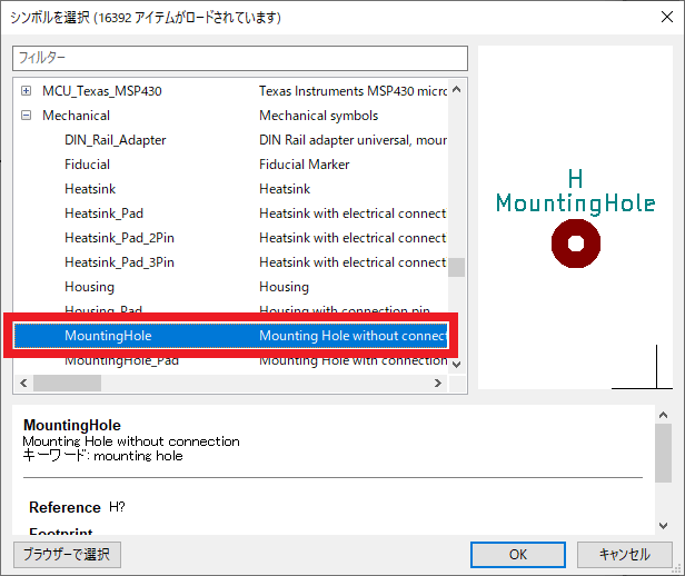 ネジの取付穴を配置します.今回は取付穴のフットプリントとして“MountingHole”を使っていますが,この場所に電子部品を取り付けるわけではないので,リファレンス番号のシルク(“H1”から“H4”)を非表示にしておきます.