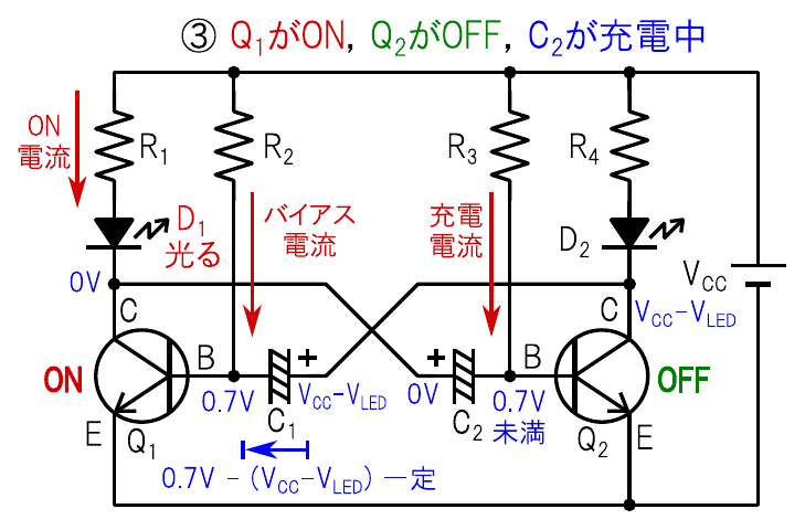 ここで生じる現象は,最初に説明した「Q1がOFFで,Q2がON」の時と基本的に同じで,Q1側とQ2側の関係が逆になっただけです.この状態ではR3を通してC2に充電電流が流れ込み,徐々にQ2のベース電圧が大きくなっていきます.そしてQ2のベース電圧が0.7V程度になりQ2がONすると,次の「ステップ4」に進みます.