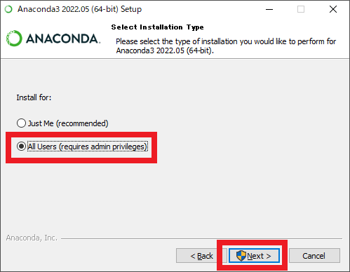 2つめのチェック・ボックスにチェックを付けると,このコンピュータ内でPythonのプログラムを実行するときに,今インストールしているAnaconda内のPythonインタプリタがデフォルトで使われるようになります.もしAnacondaの他にもPythonの実行環境を作る場合(Python公式のインタプリタをインストールする場合など),勝手にAnaconda内のインタプリタが使われると所望の処理が得られない可能性があるので注意してください.