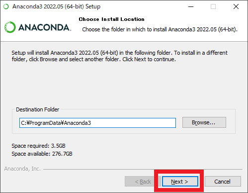 Anacondaのインストーラのサイズは約600MBです.また,インストール中に「必要なディスク空き容量」として表示されるのは3.5GBですが,実際にインストール後に作られた“Anaconda”ディレクトリのサイズは約6GBでした(筆者の環境の場合).いずれにしても,十分な空き容量があることを確認した上でインストールしてください.