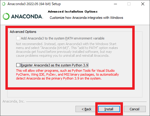 1つめのチェック・ボックスにチェックを付けると,Anacondaのインストール先のパスが環境変数の“PATH”に追加されます.もし複数バージョンのAnacondaをインストールするような場合は,ここにチェックを付けておくと今インストールしているAnacondaが優先的に実行されるようになります.ただし,厄介な問題が生じる可能性もあるので「非推奨」とのことです.