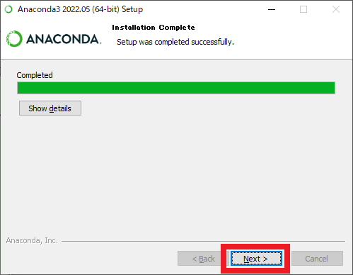 図23の画面が表示されたら,[Finish] をクリックして終了です.インストーラを閉じた後にチュートリアルを読みたい場合やそのままAnacondaを起動したい場合は,適宜チェックを付けてください.
